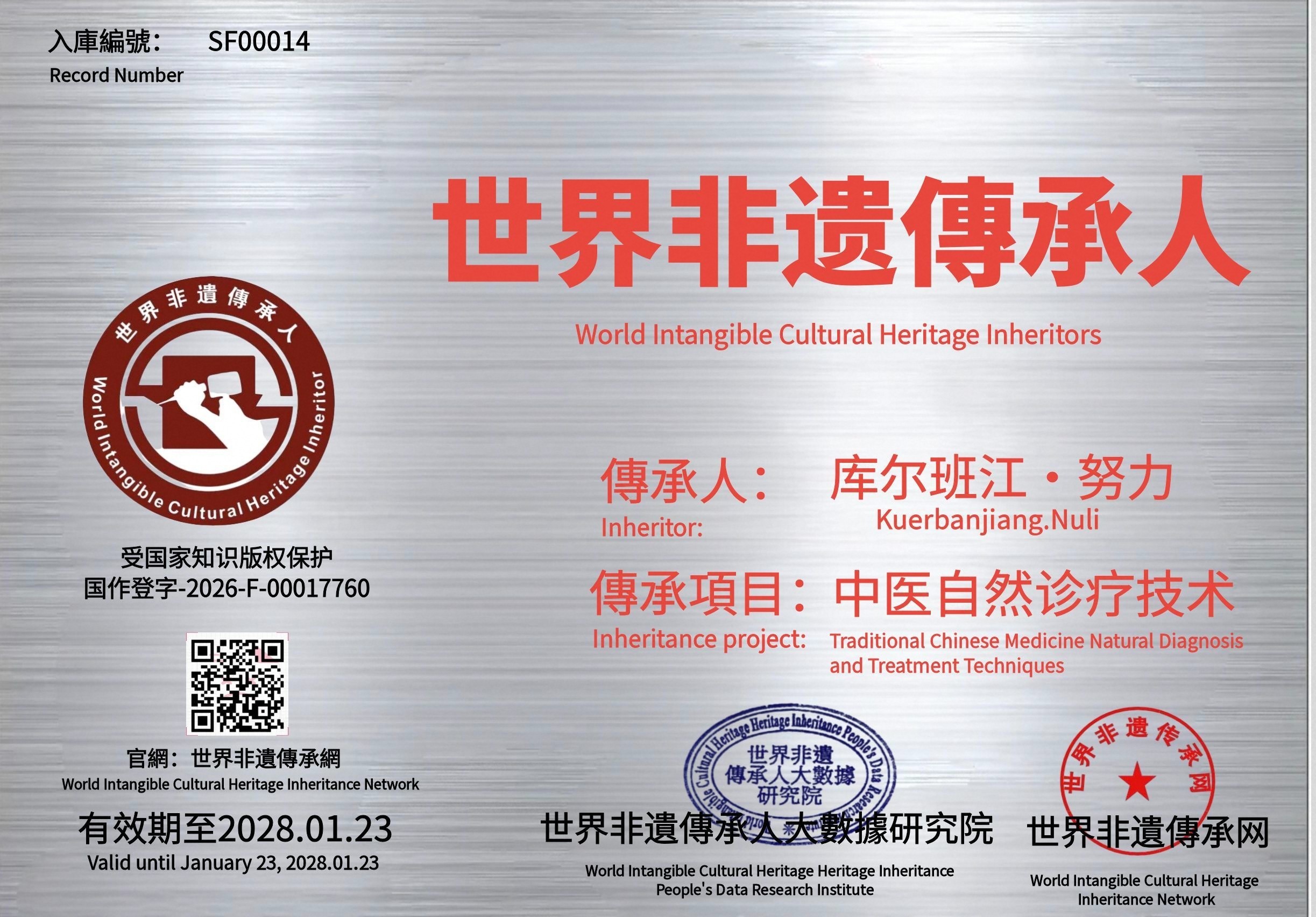 “世界非遗傳承人”荣誉品牌属自主知识产权IP,已获得国家版权局保护,登记号为“国作登字-2026-F-00017760”。这一认证不仅是对数据库技术含量和创新性的肯定,也为数据库的合法使用和持续发展提供了法律保障。