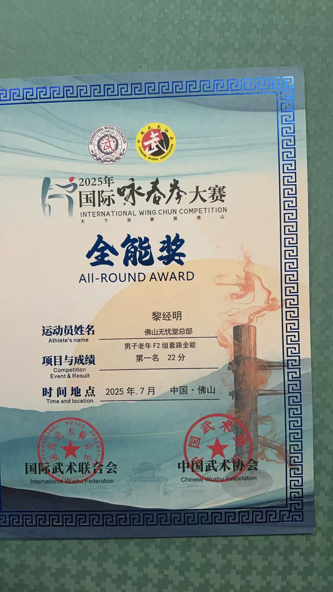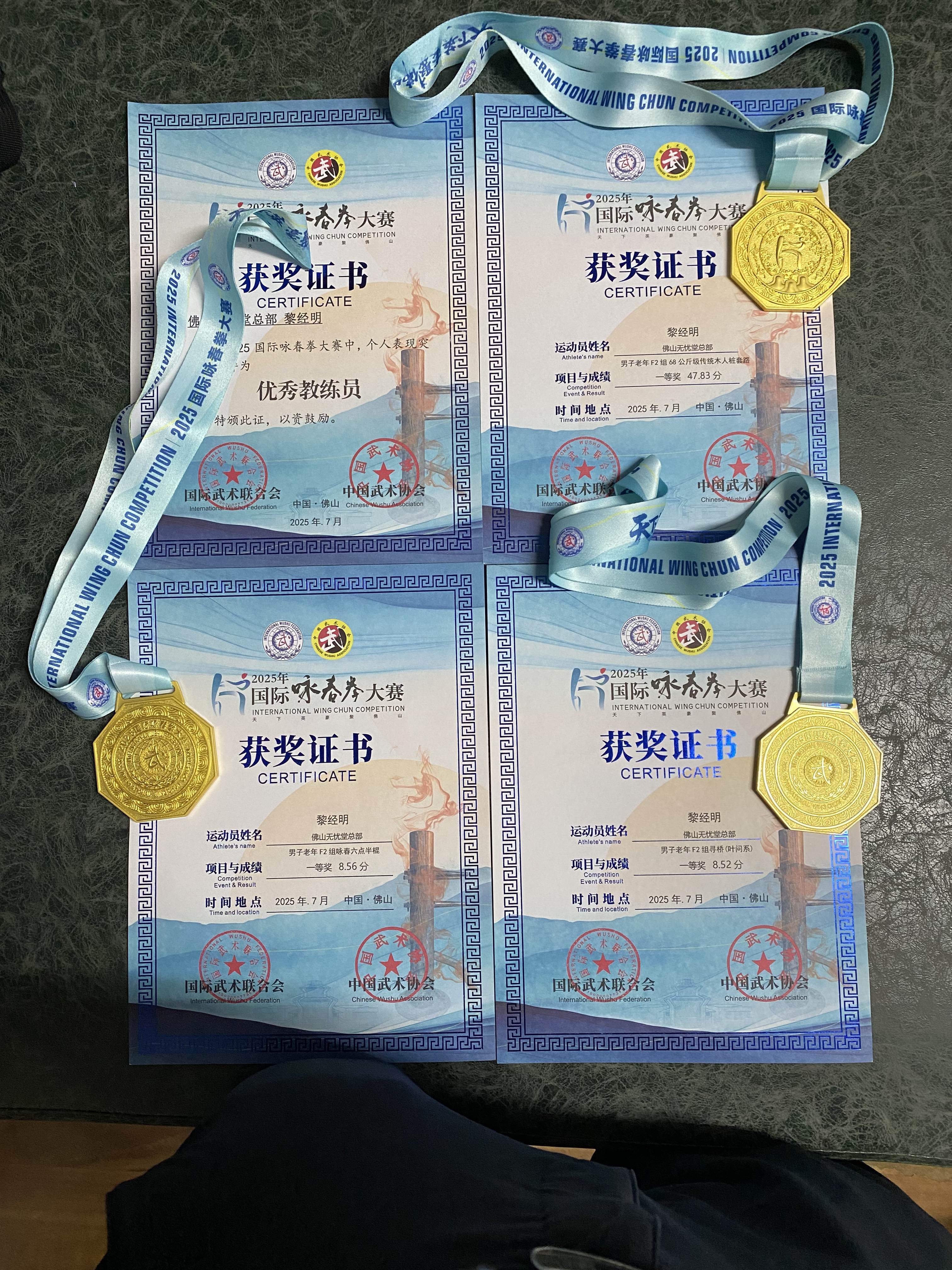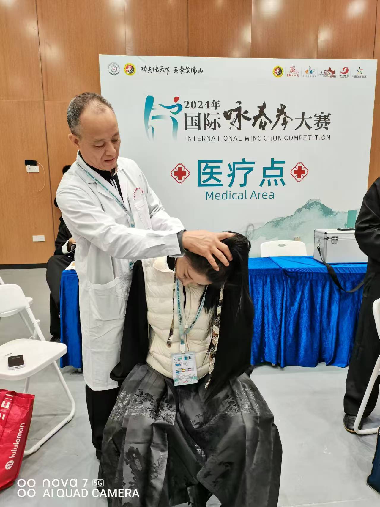 退休后,黎经明被返聘到广西中医药研究院工作,担任针灸推拿科坐诊中医师。他尤其擅长运用“咏春跌打十二手”等医武结合的手法治疗骨科疑难杂症。即便工作繁忙,他仍坚持练习和传承咏春拳。2025年国际咏春拳大赛于7月26日至31日在佛山南海西樵镇盛大开赛。7月25日,67岁的黎经明携徒弟从广西南宁匆匆赶来,再次站上赛场。作为本次大赛最年长的选手,这位佛山咏春拳梁赞第五代传人、中医(专长)医师,带着寻桥、六点半棍、传统木人桩三项参赛项目,以实际行动诠释着“医武同源”岭南文化的独特生命力。赛场上,黎经明是专注的选手;赛场下,他是备受欢迎的“名医”。在去年的大赛期间,他和弟子在休息区为选手义务治疗,用“咏春跌打十二手”缓解选手的肌肉紧张,处理运动损伤。今年,他依旧延续着这份爱心与责任。