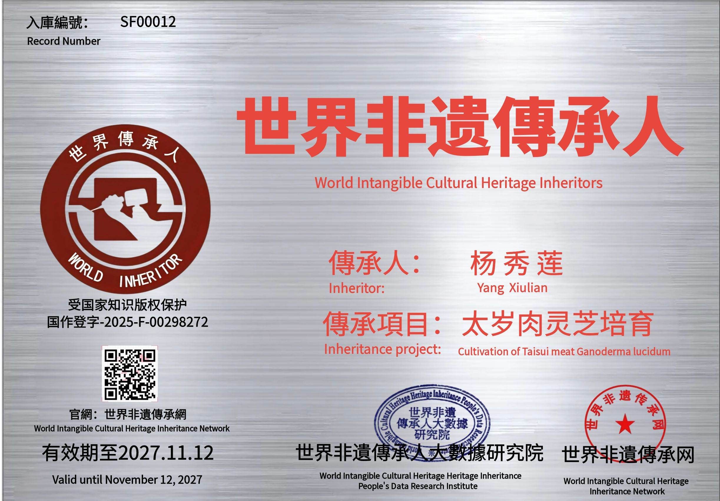 世界非遗传承网公示:2025年11月12日,经世界非遗传承人大数据研究院审核,认为河南省商丘市杨秀莲同志申报的“太岁肉灵芝培育”具有传承价值,符合申报条件,准许入库世界非遗传承网《世界传承·人才智库》。